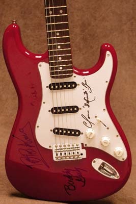 Chicago bluesmen B.B.King, Buddy Guy, Otis Rush and Clarence "Gatemouth" Brown all signed this momentous guitar. Fender Squire Strat electric guitar is deep red.