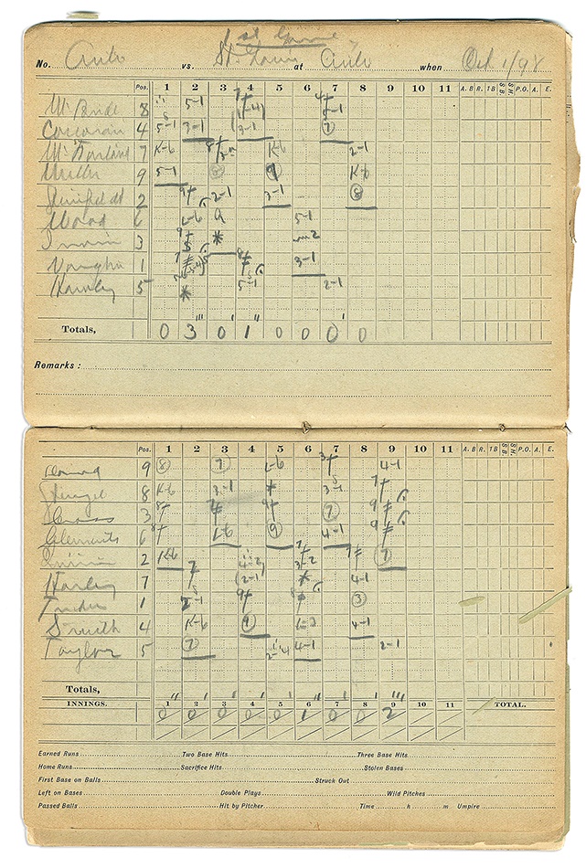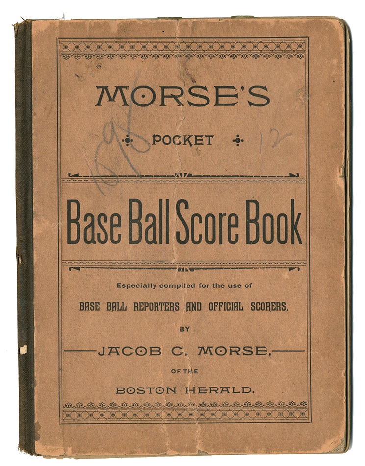 After a great start, the 1898 Cincinnati Red held on to first place for most of the season, but fell behind the Boston Beaneaters in September, finishing the season in third place. Chronicling the collapse of Buck Ewing's Reds, this superb Jacob Morse pocket scorebook was used by an important Cincinnati baseball writer of the period. The pages are filled with Reds' games from September and October against the Cleveland Spiders, Louisville Colonels, and St. Louis Browns. Top players include Cy Young, Bobby Wallace, Bid McPhee, and a 24-year old Honus Wagner in his second year. There is a beautiful Wright & Ditson ad on verso. The cover is worn and a few of the pages are separated, but nearly all the pages are filled with stats.