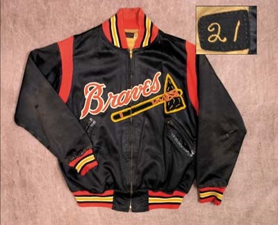 Just a remarkable find. Exquisitely crafted letterman-style jacket would be magnificent enough, purely aesthetically, but add to that its thoroughbred pedigree and we reach a new level of adoration. During Spahn's twelve years in Milwaukee, he led the league in wins no fewer than six times. The Hall of Fame. The 300 Win Club. He ranks among the true elite, making any piece from him a cut above. We all know how difficult jackets from the 1950's are, and also that the Braves style, with the famed tomahawk so expertly stitched across the chest, is among the most coveted. But check the lining by the zipper, for the yellow stitched "21" that attributes this to the superstar hurler. There is wear at the elasticized cuffs and other trim, but the black satin body is in very strong condition and is certainly wearable, though we don't recommend it. Treasure this like the piece of history that it is, and save the best place in your trophy room for display.