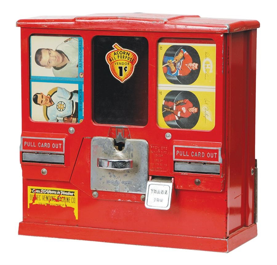 This machine was made for vending Topps and Parkhurst cards in Canada. The 12.5" x 12.5" x 6" Machine, manufactured by Premiere Gum and Card Vendor of California features two windows with a pair of Topps cards as well as a pair of Parkhursts. Irv Spencer, Abe MacDonald, Val Fonteyne and Don Warshau are the cards in the windows. This lot is in EX condition overall with Acorn 1-cent decal in the center. Baseball models are abundant while hockey is a rarer commodity.