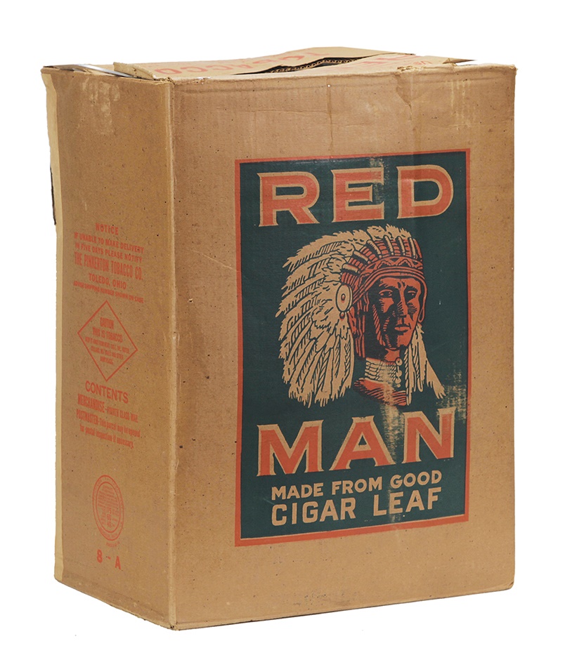 Vintage case box for Red Man Chewing Tobacco. Both sides of this large shipping box are graced with the familiar Indian Chief logo on a forest green background. It measures nearly 2 feet tall and 16 “ wide!. Although we could not find a date this box, it is very similar to what to the 1950's cases that would have contained the baseball cards. Over all, very good condition with great display qualities.