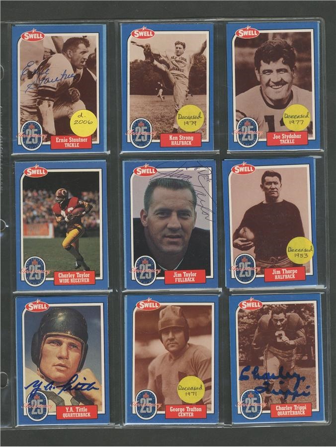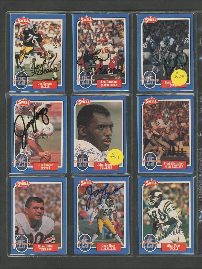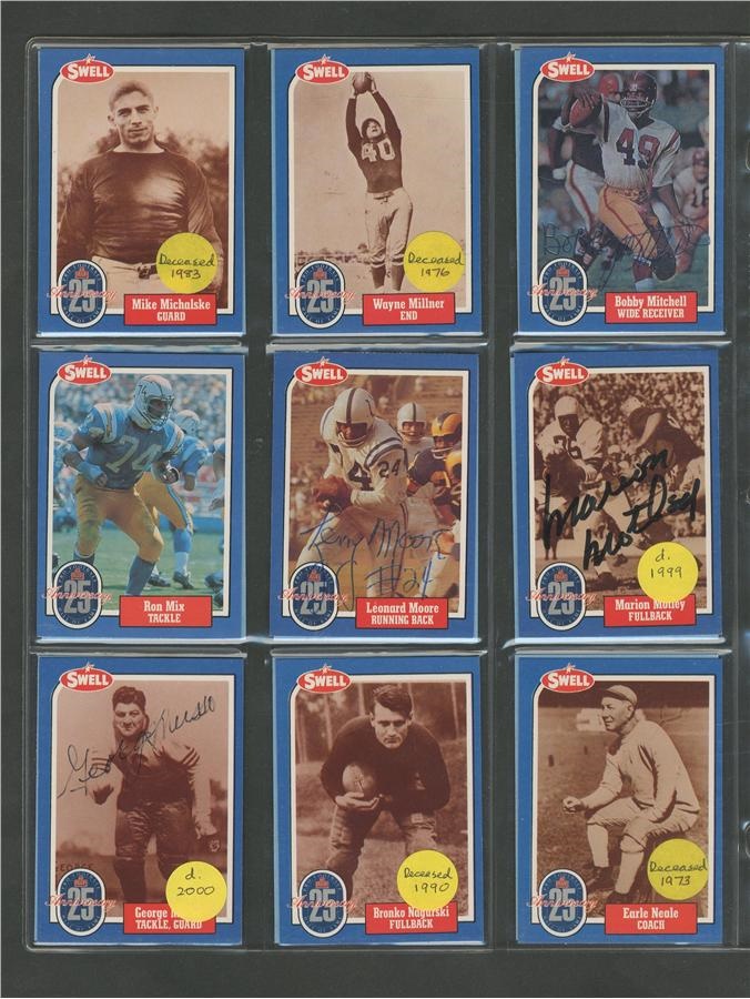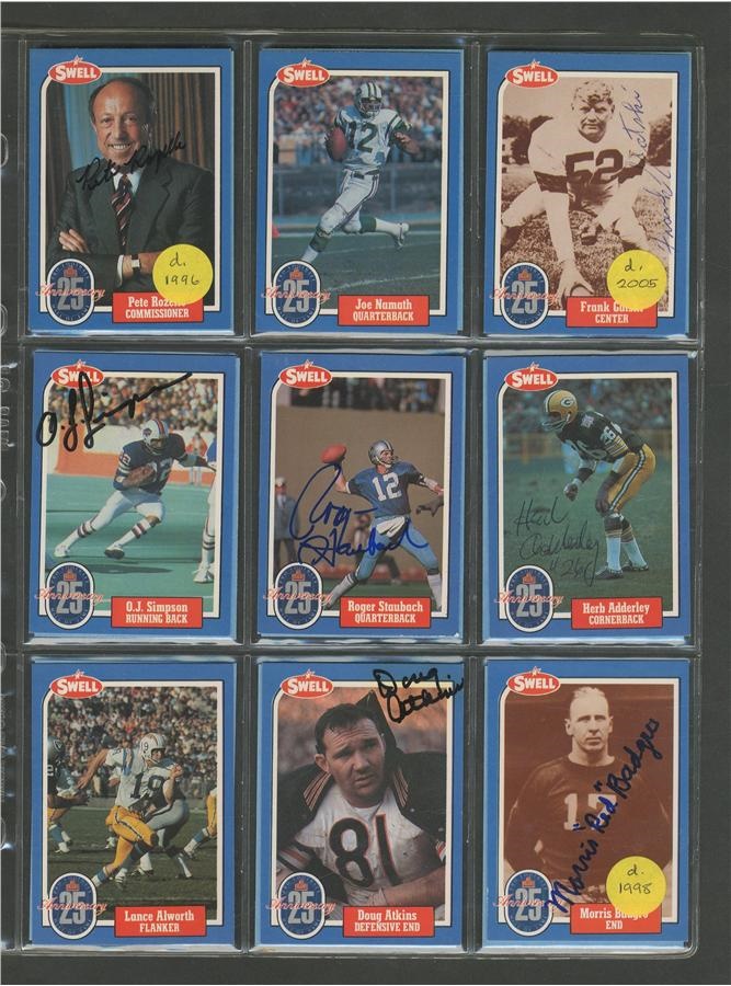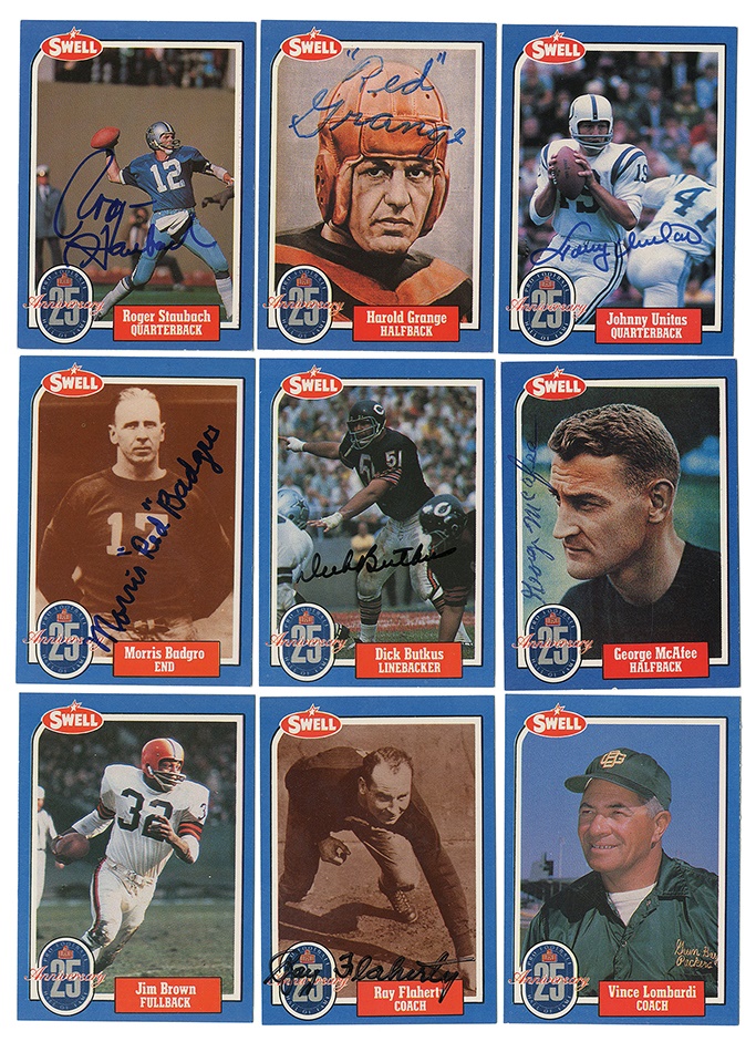 A who's who of pro football, this 25th Anniversary collection of cards averages NRMT condition with signatures all in pen or felt-tip marker and average 8/10. Included here are: Pete Rozelle, Roosevelt Brown, Weeb Ewbank, Red Grange, Otto Graham, Mel Hein, Jack Hinkle, Don Hutson, Bronco Nagurski, George McAfee, Jack Mitschke, Art Rooney and Johnny Unitas. There are some unsigned cards from the set also.