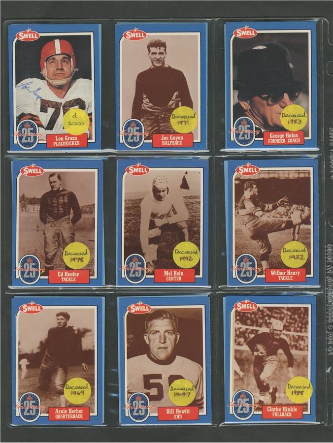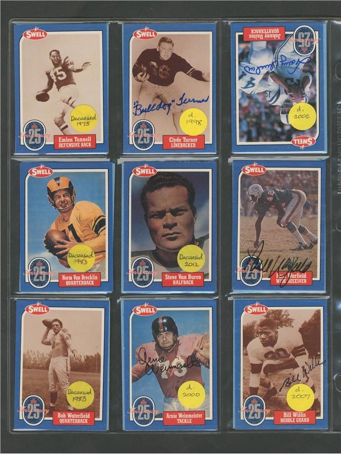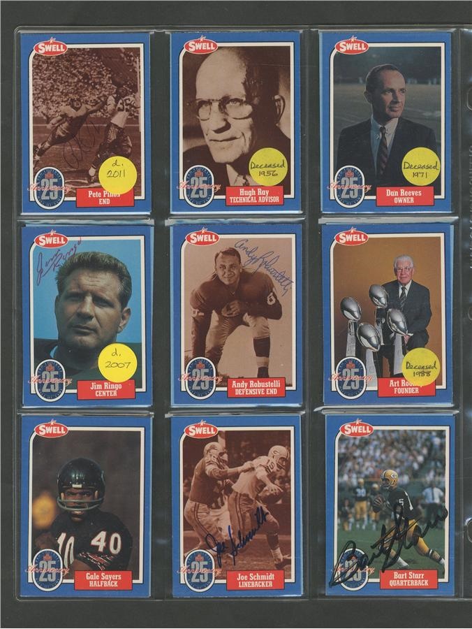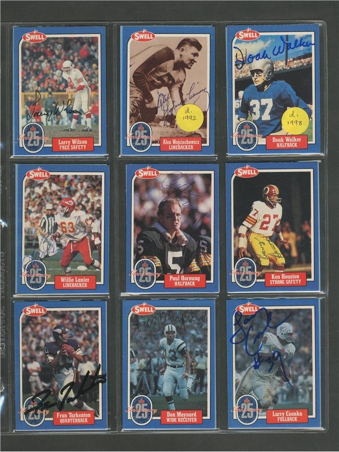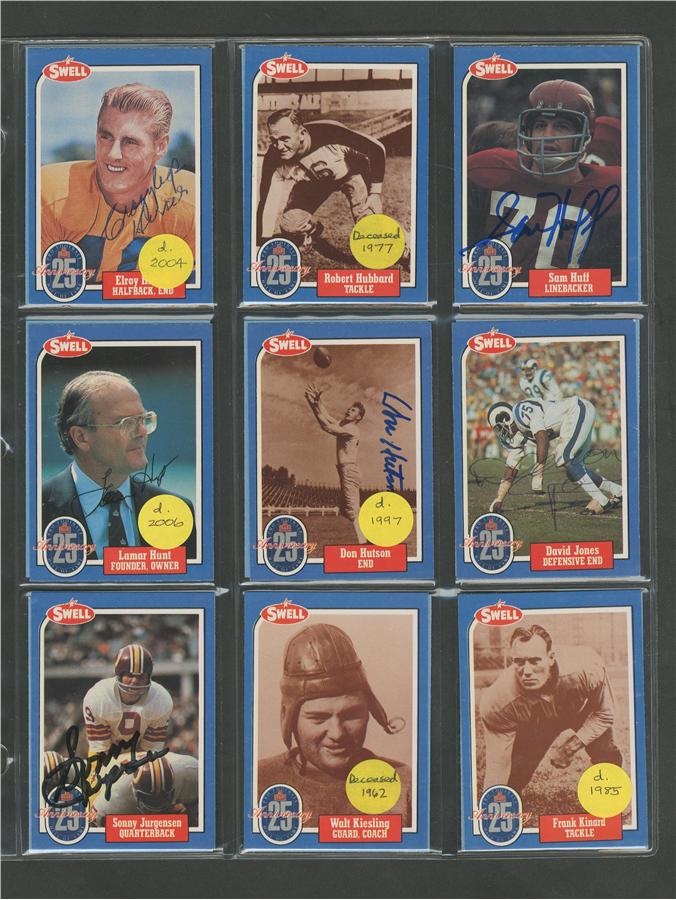 A who's who of pro football, this 25th Anniversary collection of cards averages NRMT condition with signatures all in pen or felt-tip marker and average 8/10. Included here are: Pete Rozelle, Roosevelt Brown, Weeb Ewbank, Red Grange, Otto Graham, Mel Hein, Jack Hinkle, Don Hutson, Bronco Nagurski, George McAfee, Jack Mitschke, Art Rooney and Johnny Unitas. There are some unsigned cards from the set also.