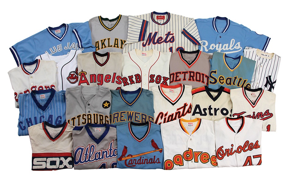 Featured here are 31 game worn jerseys from each MLB team, mostly from the 1970's and 80's. The lot includes: 1980 Dodgers, 1982 Giants, 1979 Braves, 1982 Mets (Staub name removed), 1999 Reds, 1979 Cubs, 1984 Phillies, 1979 Expos, 1982 Cardinals (no number), 1984 Padres, 2001 Pirates, early 1980's Astros, late 1990's Diamondbacks, 1994 Rockies, 1994 Marlins, 2006 Nationals, 1979 Tigers, 1983 A's, 1980 Mariners, late 1980's Royals, 1980 Red Sox, 1975 Angels, 1983 White Sox, 1981 Rangers, 1981 Orioles (Ripken Sr. w/ inside pocket), 2005 Indians, 1985 Yankees, 1985 Blue Jays, 1976 Brewers, 1998 Devil Rays, 1977 Twins. A good combination of home and road jerseys, this lot also includes a few jerseys with All-star patches and black armbands.