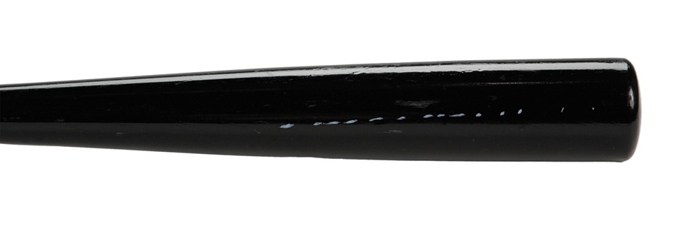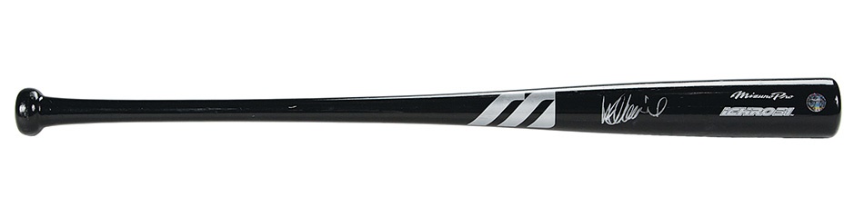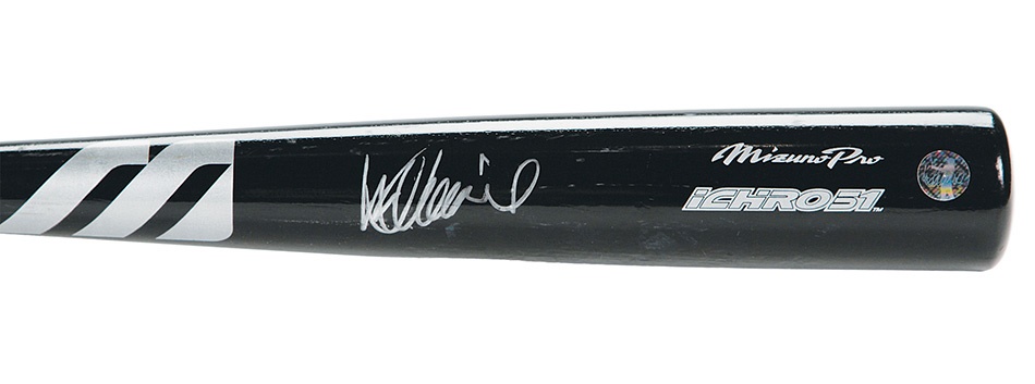 Japan's greatest baseball import - Ichiro Suzuki - took American baseball by storm in 2001, shattering Willie Keeler's major league record with ten 200-hit seasons, includinga record 262-hit campaign in 2004. This Mizuno 51 ash bat with black finish weights 30.7 oz and measures 33.5". It features an Ichiro hologram on the barrel where the two-time A.L. batting champ signed it in 8/10 silver on the barrel. Shows very nice use.
