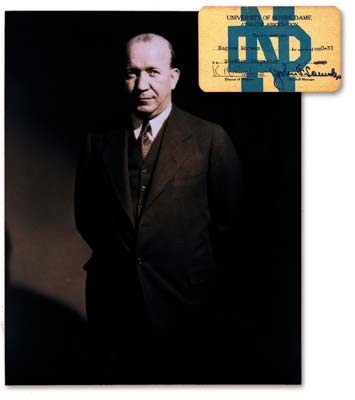 Made out to Eugene Moreau for the 1930-31 season certifying him as stadium inspector. Rockne is considered the greatest college football coach of all time and died tragically in a plane crash in 1931. This comes with a great unsigned photo of the Rock. Condition is NRMT-MT.