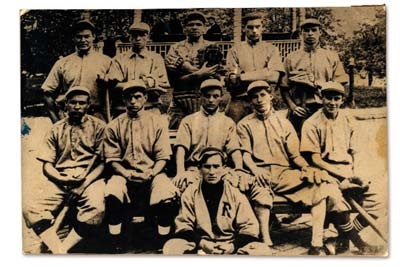 Printed about a decade after this photo was snapped at the famed St. Mary's school where the young George Herman Ruth first displayed the baseball talent that made him a god. He stands at top center, arms crossed, holding a glove and catcher's mask. Only a small handful of these could possibly exist today. Condition is very strong (EX), and will make for a terrific display.