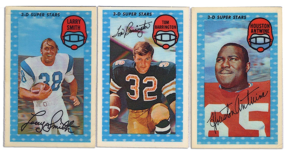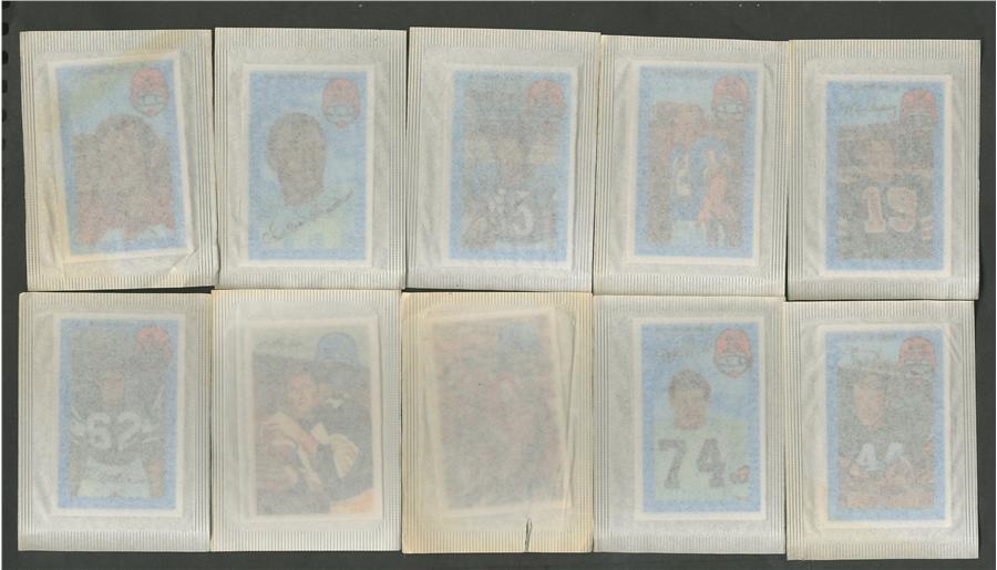 A near complete set of 1971 Kellogg's Football in unopened packs. 57 of 60 are still housed in their original wrappers. These were only distributed one per box so imagine the amount of cereal eaten to produce this set. Wrappers are EX-MT. The three cards that are present but are not in original wrappers are #1, 4 and 42. As a bonus there are six 1970 unopened Kellogg's packs(EX-MT).