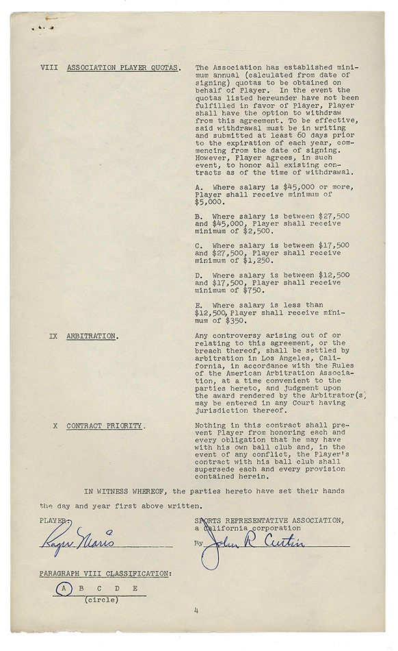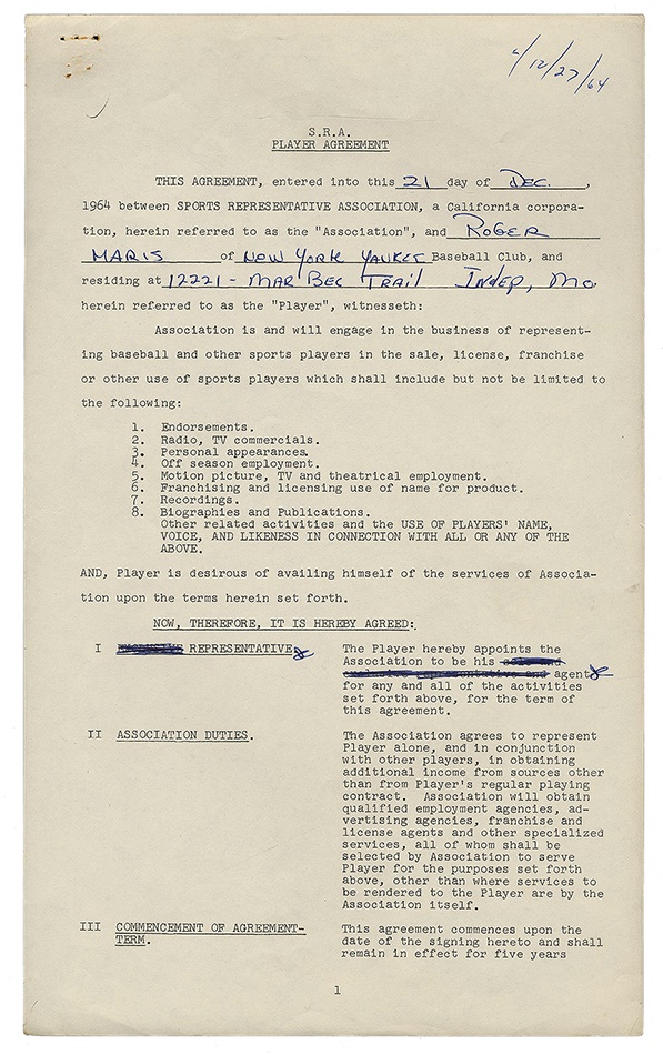 Roger Maris played for 12 seasons on four teams from 1957 through 1968. Maris hit a Major League record 61 home runs during the 1961 season for the New York Yankees, breaking Babe Ruth's single-season record of 60 home runs set in 1927. Maris' record stood for the next 37 years. This unique piece of history is a signed Contract by Roger Maris for Marketing Representation. The contract details are for the Sports Representative Association to get endorsements, Appearances, Film deals, etc. It’s a total of four pages with notations. Maris’ signature is in blue ballpoint ink and is certainly a 10/10 – it’s crystal clear!