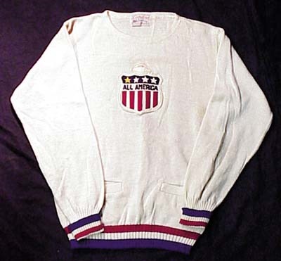 Delectable football sweater presented to him while at Northwestern. From Christy Walsh's "All American Board of Football" with this graphic Catalina tagging in the collar. Great patch on front in felt. VG-EX.