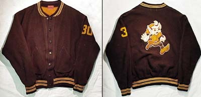 One of the first jackets ever worn by this high level Hall of Famer. Gorgeous style in thick brown wool with orange piping. Sports his original "30" on the sleeve in felt. Tagged in the col-lar "King O' Shea" with fine orange lining inside. Best of all is an amazing embroidered patch of the "Brownie" on the verso. This amazing pixie is one for the record books. One of the nicest football jackets we have ever seen.