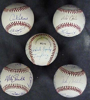 Personally acquired sig-natures follow special themes. All are NRMT on Official A.L. and N.L. balls. 1) 1990's Stars: Griffey, McGwire, Ripken and seven more. 2) Batting Champs: Alou, Groat, Vernon, Kaline, Mize and three more. 3) Great Pitchers: Ryan, P. Neikro, Feller, Hunter, Palmer, Drysdale, Ford, McLain and seven more. 4) Sluggers: Bonds, Snider, Cepeda, Mathews, Stargell, Killebrew and eight more. 5) N.L. M.V.P.'s: Musial, Schmidt, Rose, Garvey, Stargell, Banks and three more. All balls and sig's NRMT.
