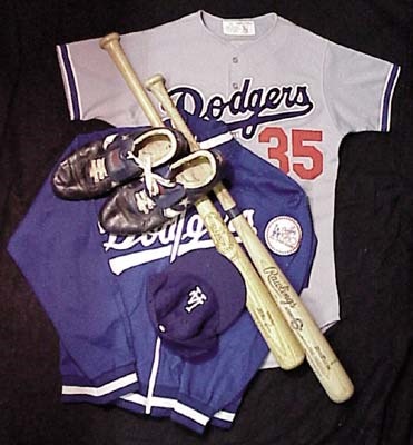 1) 1968-72 Willie Davis H&B K55. Cracked. 2) 1987 Mike Marshall Rawlings 435A. Cracked. 3) Early 1980's Steve Garvey game worn cap. Number "6" in marker under visor. 4) 1980's Mike Marshall game worn Converse spikes. Number "5" in marker on heels and inside. 5) 1980 Steve Garvey warm-up jacket. "Speedline" size medium tag in collar. All-Star Game patch on left sleeve. "Garvey 1980" embroi-dered in tail. 6) Early 1980's Bob Welch game worn road jersey. Name on back with number "35." "Goodman [size] 43" tag in collar. Good use.