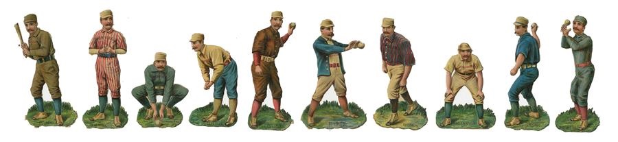 Set of 10 die cut scraps featuring the professional teams of the time. Colorful and fragile, these were meant to be pasted in a scrap book. Exceptionally clean condition overall NM-MT.