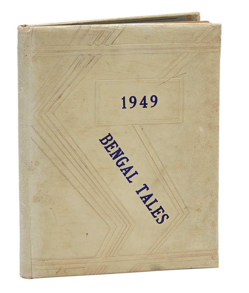 Mickey Mantle was already toiling in the minor leagues when his senior high school yearbook was published. The Class of 1949 from Commerce High was so small that there are very few surviving books. Mantle is featured throughout this 8.5" x 11" yearbook, including his football and basketball exploits. He was also voted "Most Popular" boy along with his counterpart, a less-familiar Bonnie Smith. The condition is EX but the last signature page has been torn out so it must be downgraded to VG. There were only 41 seniors in Mantle's graduation class so this is a real rarity.