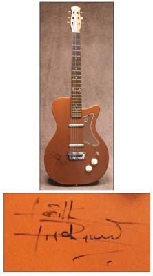 A vintage, 1968 electric Danelectro guitar that Keith Richards pur-chased and toyed around with. Hand signed and acquired at a 1981 Rolling Stones rehearsal. Some wear, overall Excellent.
