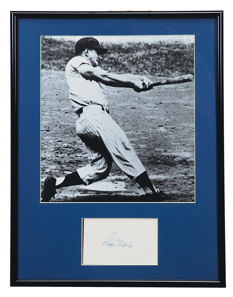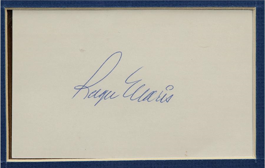 Offered here is a beautiful unlined 3" x 5" cut signed by Roger Maris in blue ink with a photo of Maris swinging his bat. The signature grades 9/10. Measures 14.25" x 18.25". LOA.