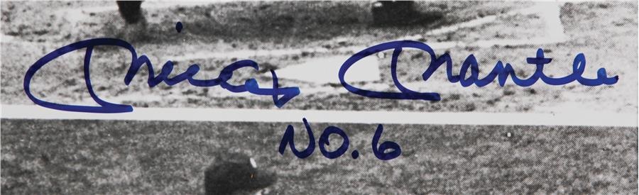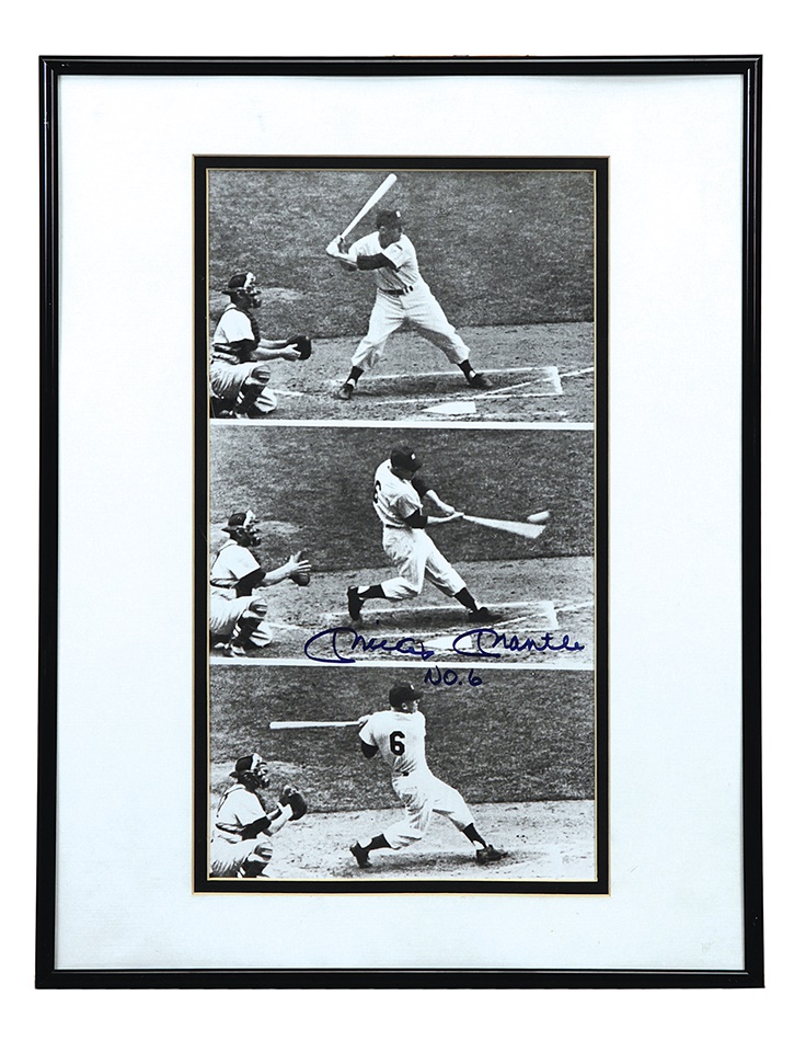 This 8" x 14" action panel shot depicts a young Mantle at bat during the first half of his rookie season in 1951. He is seen wearing #6. In large, clear letters Mantle has signed his name and number with a blue Sharpie - a PERFECT signature. Framed to 14" x 18".