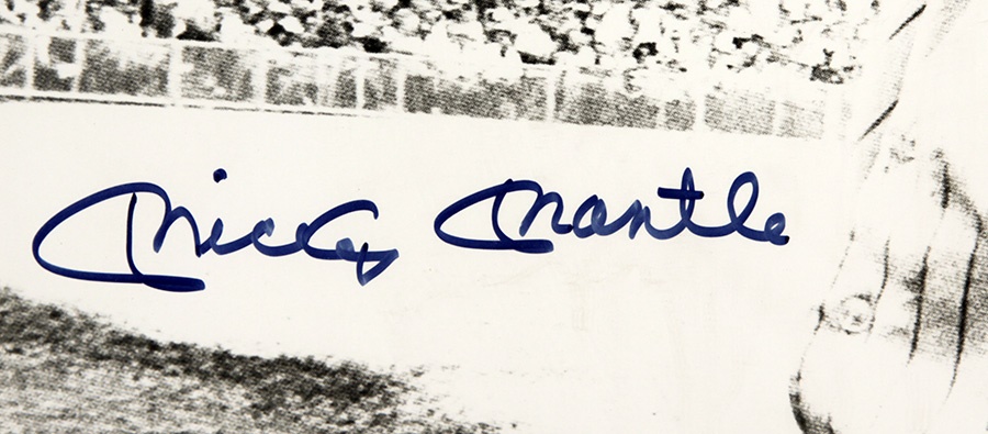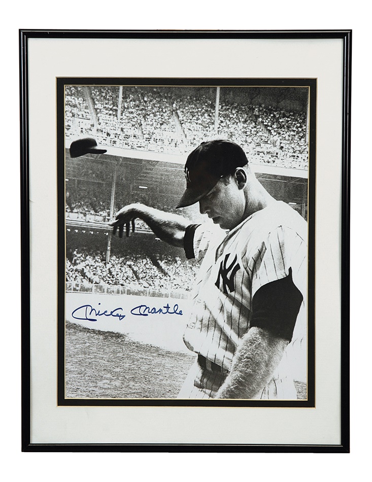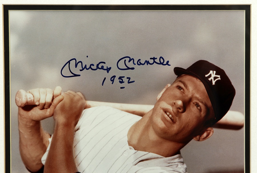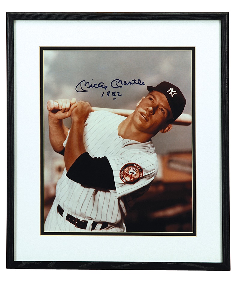 Measuring 11" x 14", the first photograph shows Mantle tossing his batting helmet and includes a perfect signature made with a blue Sharpie. The second photograph also includes a perfect blue Sharpie signature and features Mantle in a color batting pose. Underneath his name he has inscribed the year, 1952. The first is framed to 14.25" x 18.25". The second is framed to 16" x 18.5".