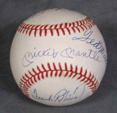 That most elusive of vaunted clubs. Signed by Mickey Mantle on the sweet spot, Carl Yaz, Frank Robinson &Ted Williams. Mint on an OAL Bobby Brown baseball.