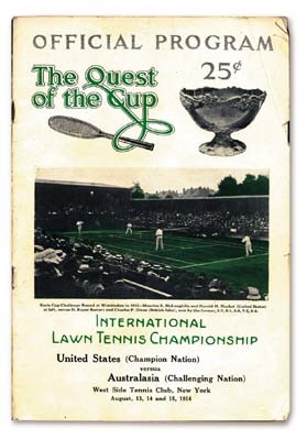 A rare program featuring the United States versus what is termed on the cover as "Australasian." This elaborate sixty-four-page program from the West Side Tennis Club is of exceptional quality with only a small cover chip and minimal creases o/w EX.