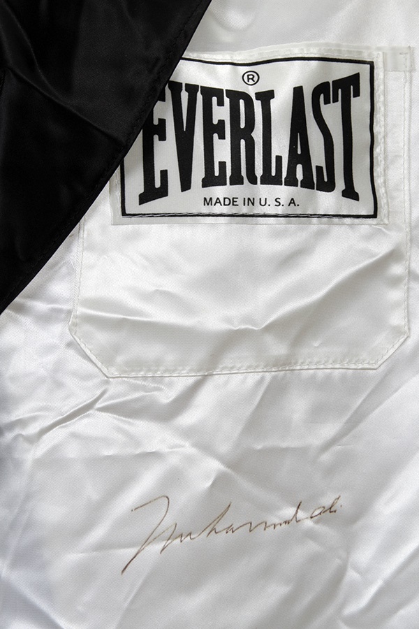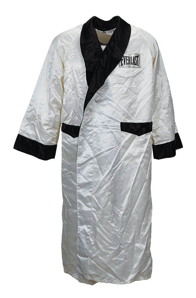 This is an original, full length, Everlast, white satin with black trim boxing robe. Includes black sash. Boldly signed on the front in flair pen by Muhammad Ali. Large, bold signature rating 8/10. Signature appears to be from early 1980's. Robe is clean. Wonderful Muhammad Ali display item.