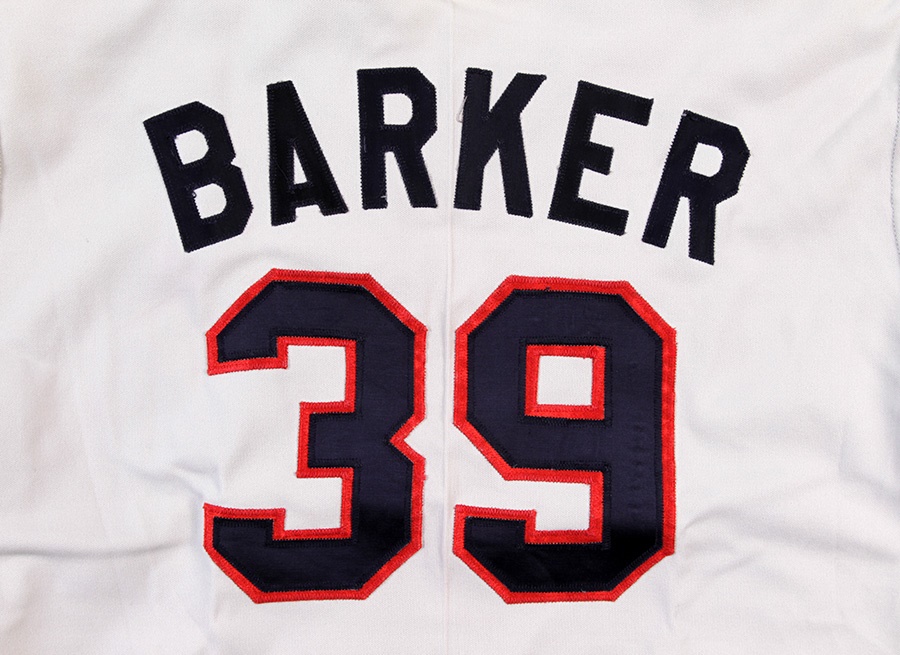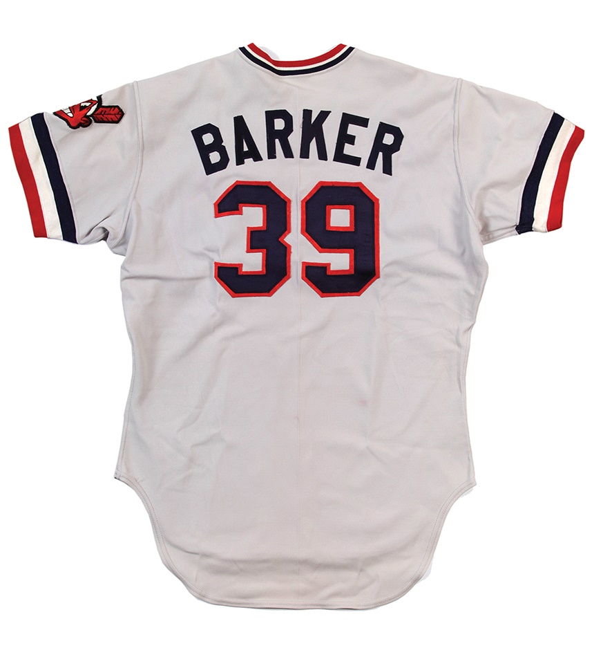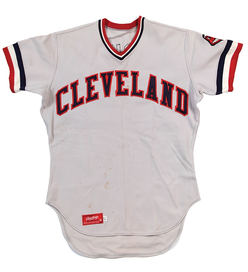 One year before he threw his perfect game against Toronto, Len Barker wore this road jersey for the Indians. That season, the right-hander enjoyed career highs of 19 wins and 187 strikeouts that summer as the ace of a 79-81 Cleveland club. The grey, V-neck pullover top reads "CLEVELAND" on the front with Rawlings size 46 - Set 1 1980 tagging on the outer tail. "BARKER 31" is on the verso, and there's a Chief Wahoo patch on the left shoulder. Shows excellent use. Barker would go on to retire all 27 Blue Jays he faced on May 15, 1981. At the time, it was just the 10th Perfect Game in Major League history.