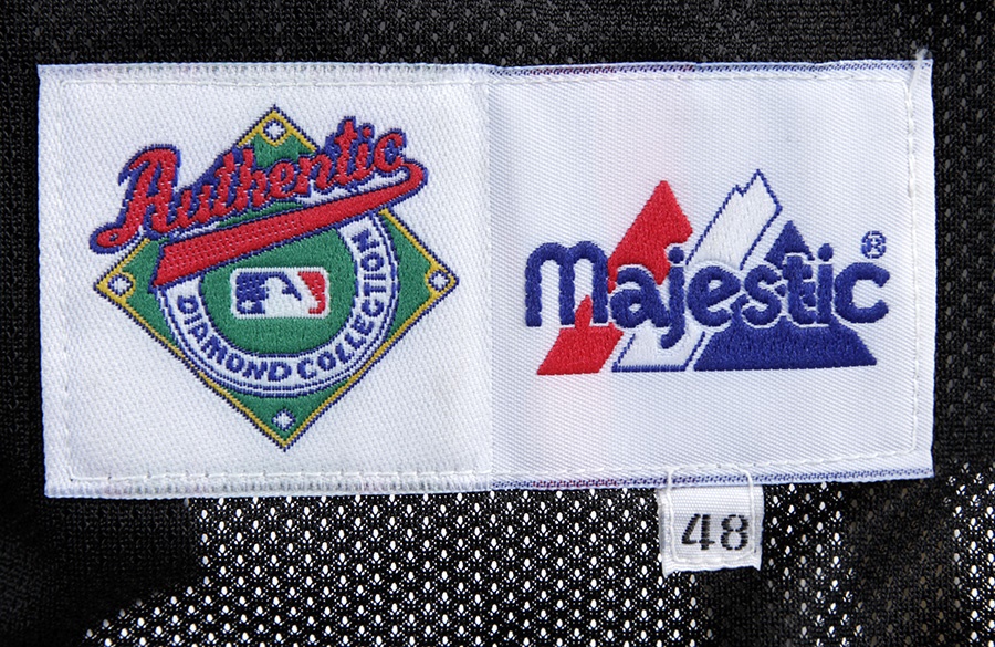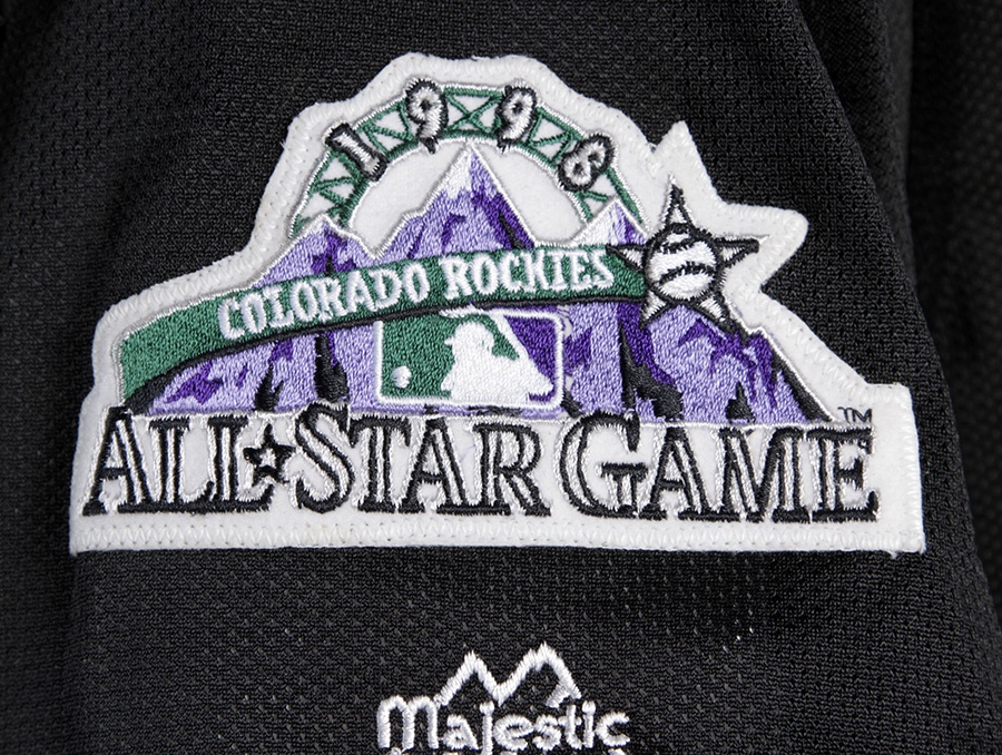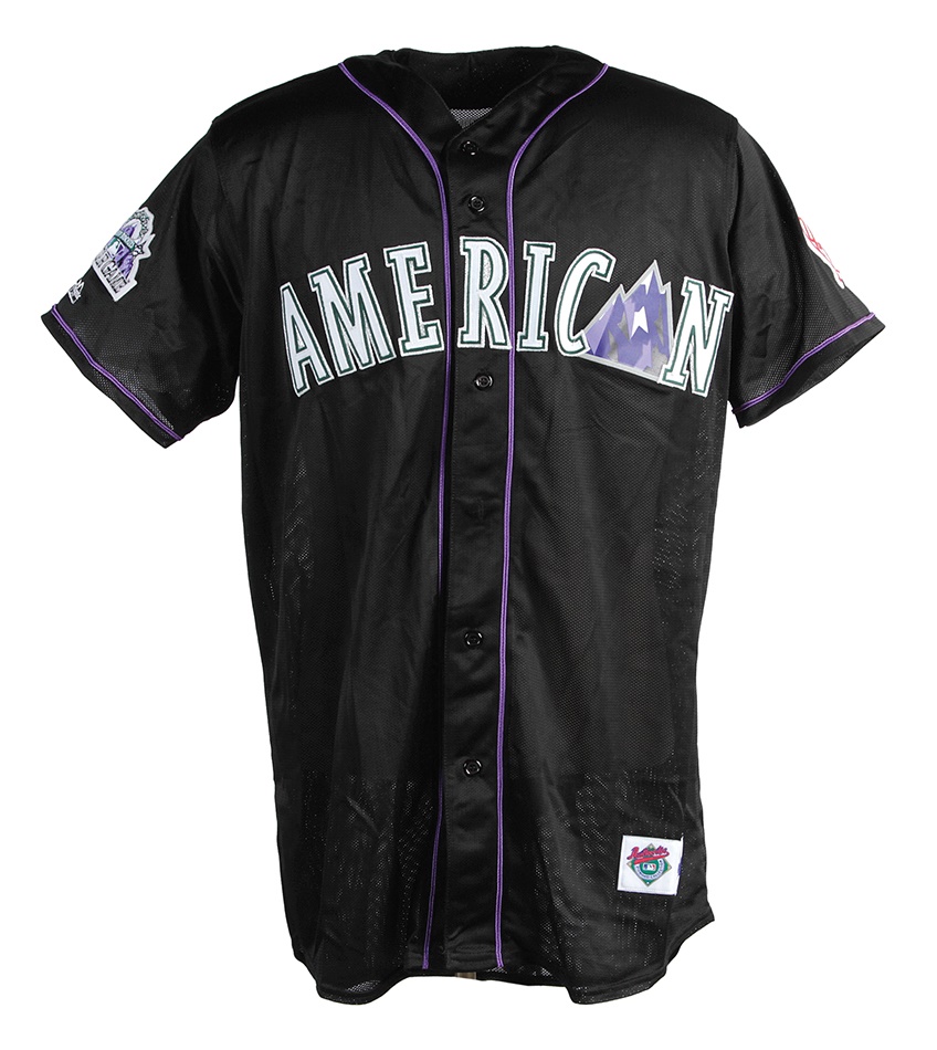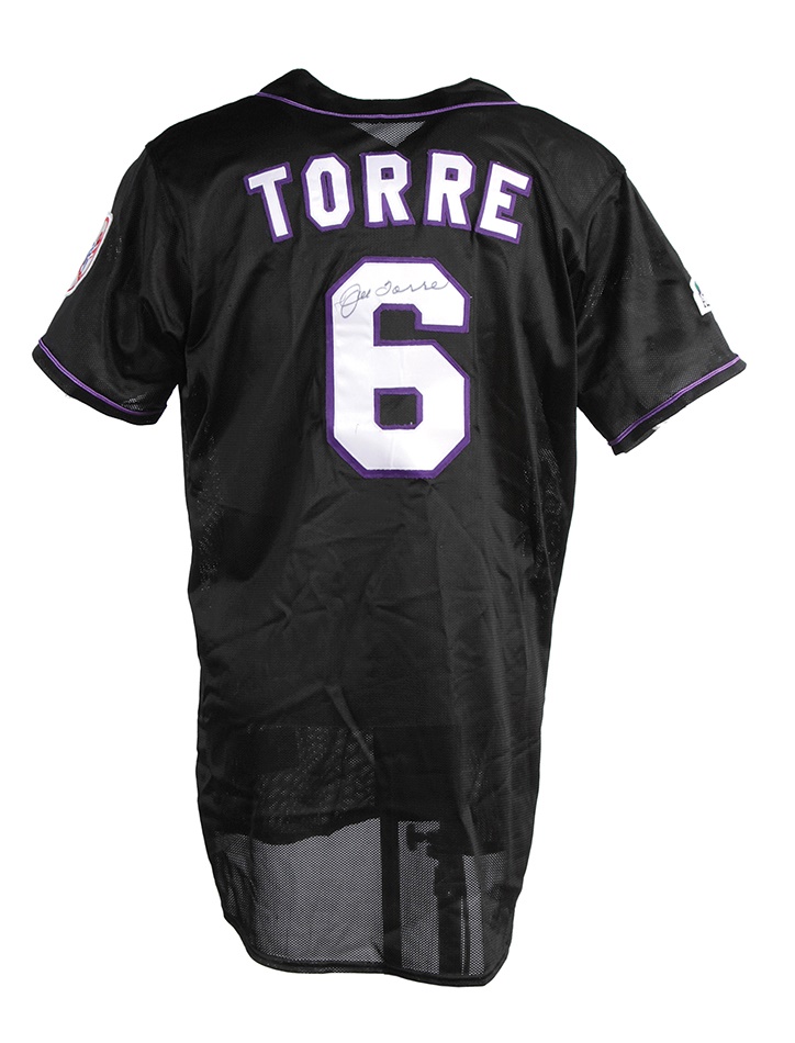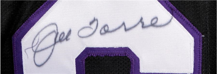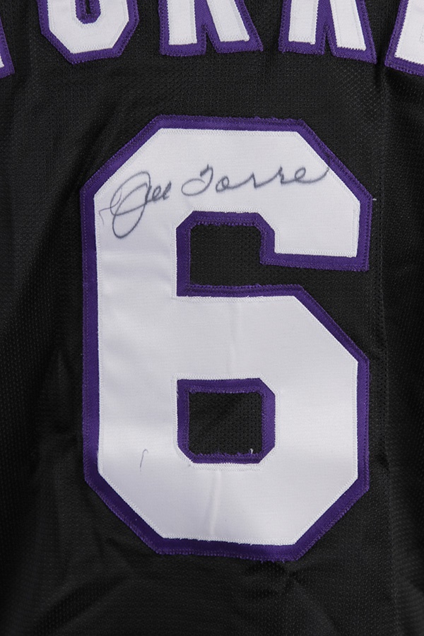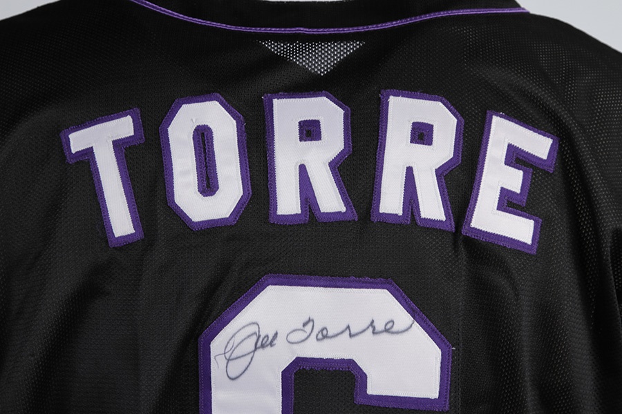 1998 was a magical season for Joe Torre. His Yankees rattled off 114 wins en route to the second of his four World Series titles in four years. He was also a coach for the American League All-Star Team that outslugged the NL at Coors Field, 13-8. Torre wore this black and purple jersey both in that game but also during the preceding Home Run Derby. AMERICAN is displayed on the front with a purple mountain comprising the second "A." A Yankees patch is on the left shoulder, and Rockies All-Star-Game patch on the right. Majestic tag with size 48 indication on the outer tail, while an XL washing instruction tag is on the inner tail. TORRE 6 is on the back with the skipper hand-signing inside the top of the numeral (8/10). Comes with an LOA from his son, Michael Torre.
