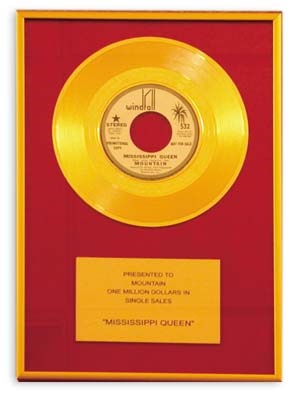 For all you Leslie West fans, this unique collection consists of an Atlanta Pop Festival poster from 1969 featuring cari-catures of many bands that played there. Bands at the festival included Mountain, Led Zeppelin, Blood, Sweat &Tears, Johnny Winter, Canned Heat, Janis Joplin, and many others (VG+). Included as well is a Gold Record Single Award presented to Mountain for one million dollars in sin-gle sales for "Mississippi Queen," and features a Windfall promotional label on the disc (NRMT).