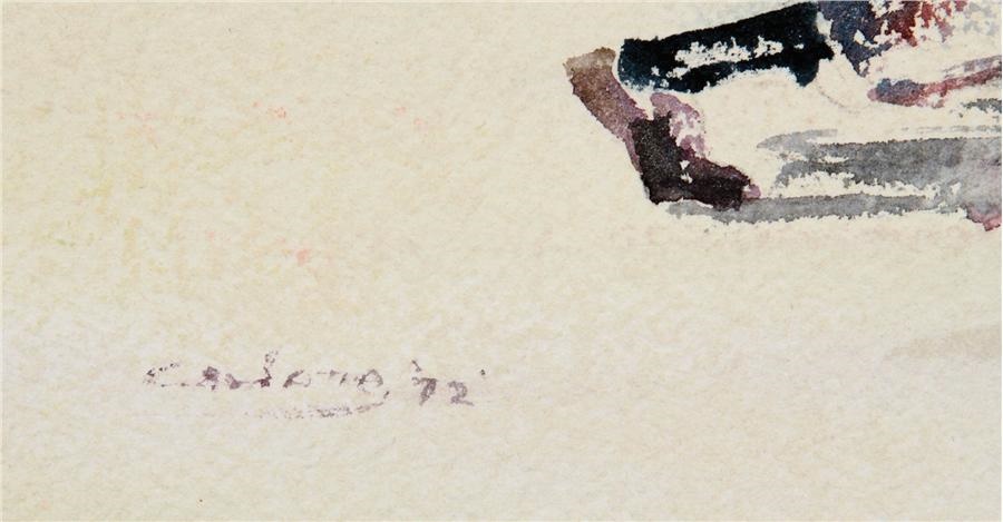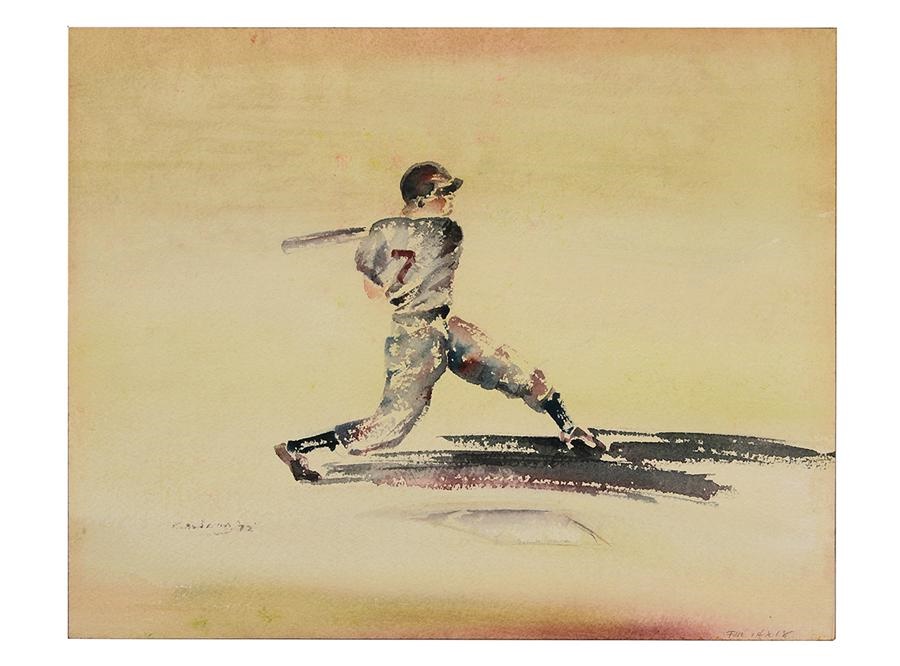 Here is an excellent watercolor painting of Mantle in full swing. Executed in 1972 and signed in the lower left corner, this gem measures 15" x 12". Mantle's number "7" is displayed prominently.