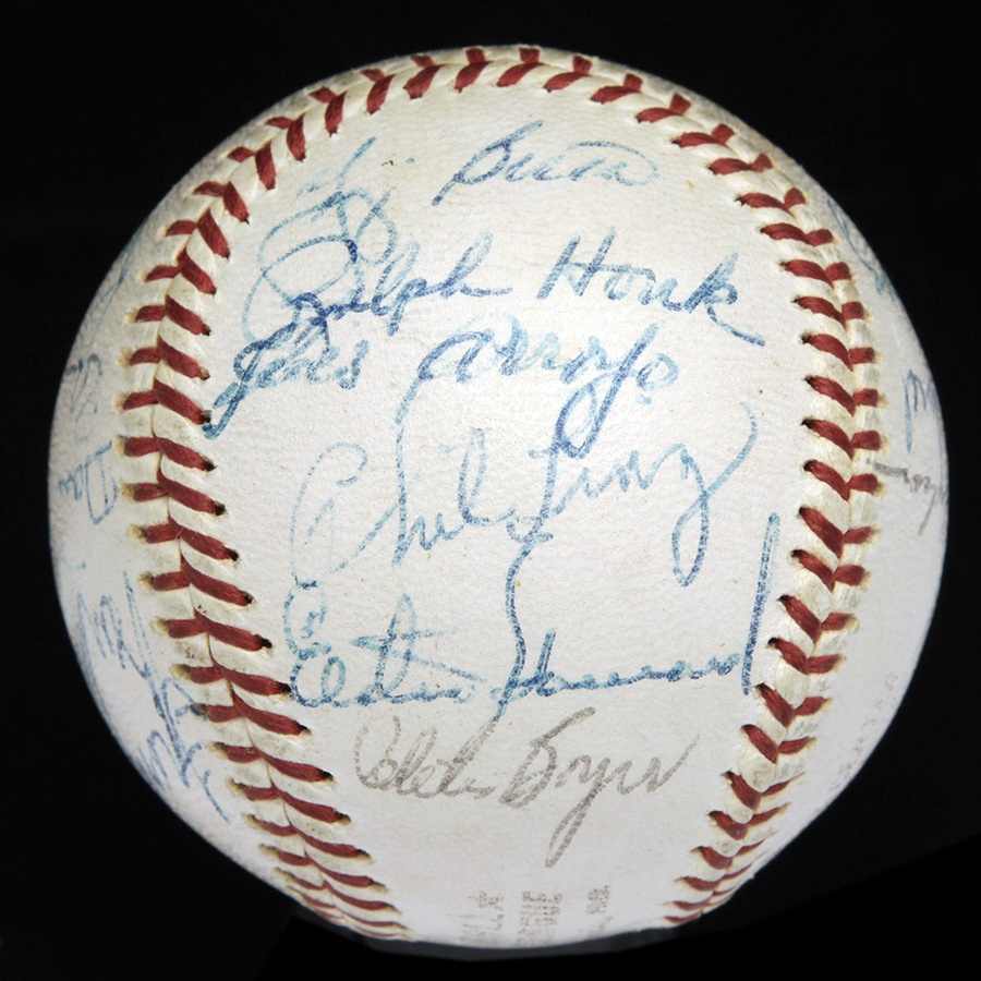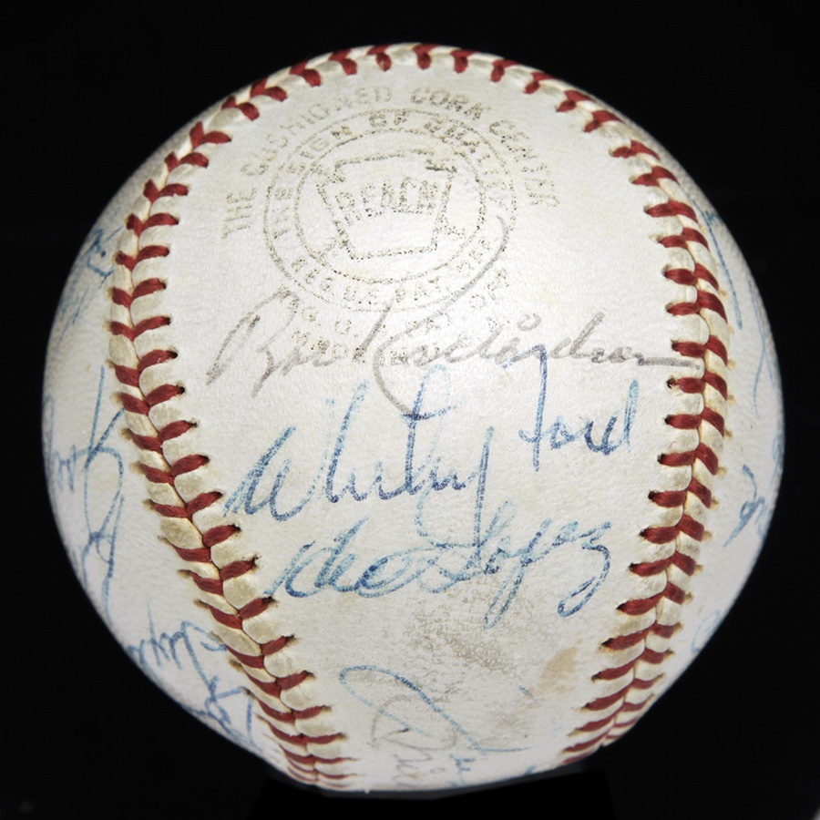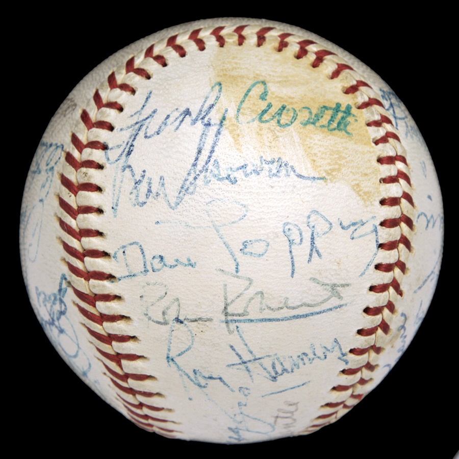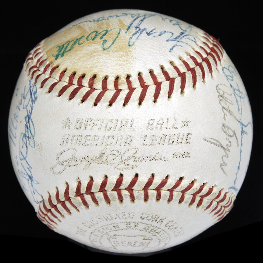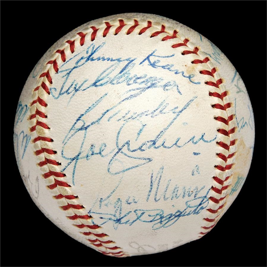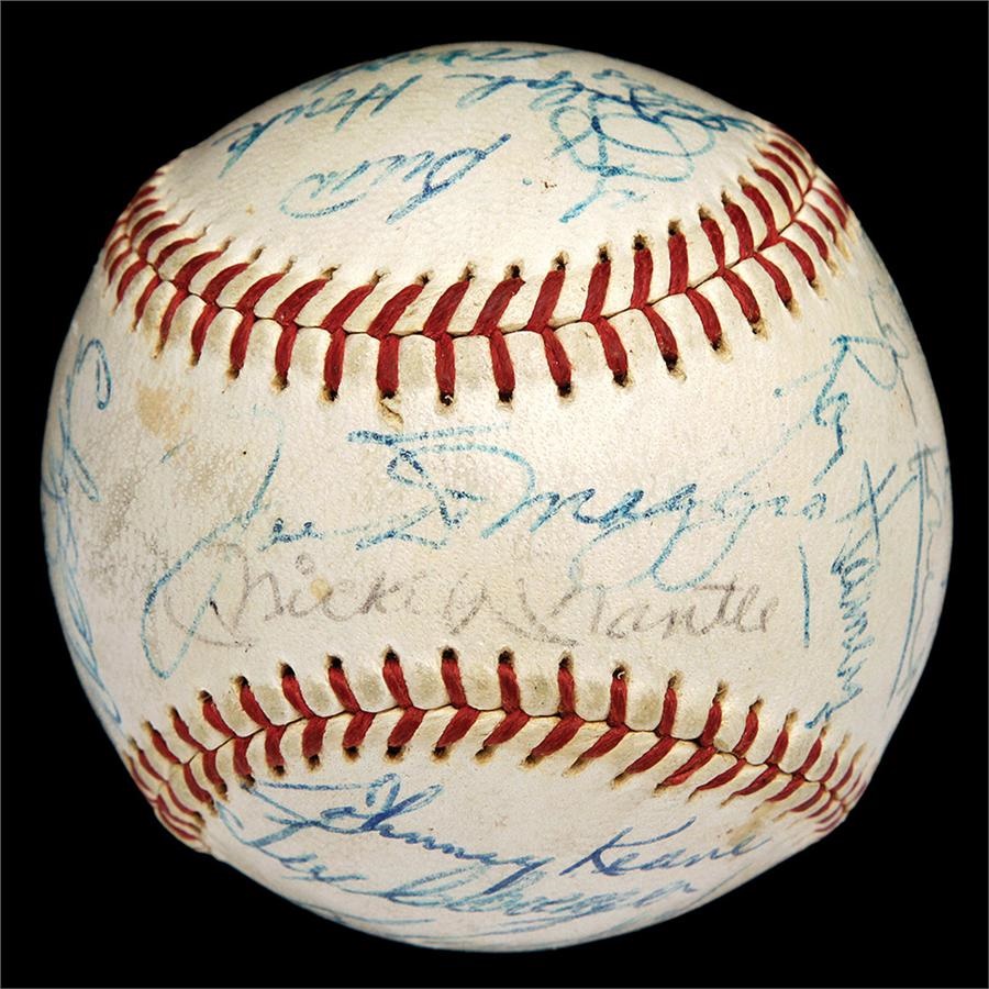 From spring training of 1962 comes this baseball signed by 22 members of the 1962 New York Yankees, who seven months later would be taking another trip down the Canyon of Heroes celebrating their 20th World Series crown. There are 22 signatures on the official Reach Joe Cronin Ball, highlighted by Mickey Mantle and Joe DiMaggio on the sweet spot. Other notables include Ford, Berra, Rizzuto, Maris, Howard, Crosetti, Roberts and League President Joe Cronin. Signatures Range from 5-9 out of 10. JSA Full LOA. The Yankees defeated the New York Giants in seven games in the Fall Classic. It would be their last championship for another 15 years.