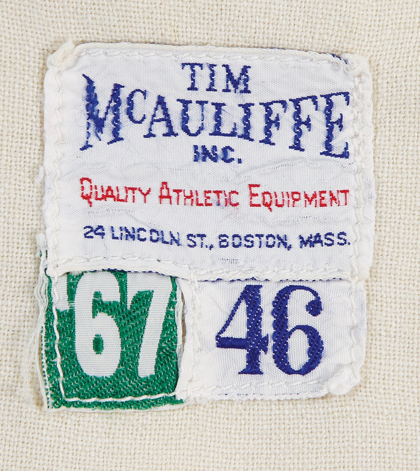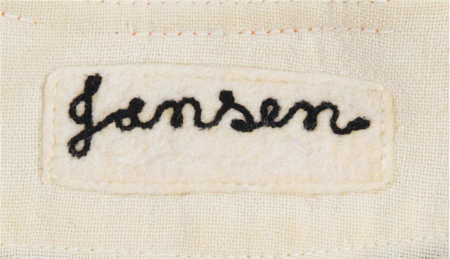 Larry Jansen was the winning pitcher in the "Shot Heard Round the World" Game in 1951 which clinched the NL pennant for the New York Giants. After nine seasons in the Major Leagues, Jansen finished with 122 wins, 842 strikeouts, and an ERA of 3.58. He would return to the Giants as a pitching coach. This San Francisco Giants home jersey from the 1967 season has a McAuliffe tag with "67" and "46" sewn to the front tail. There is a Jansen strip tag in the collar. The "46" on the back is a replacement. Some use visible.