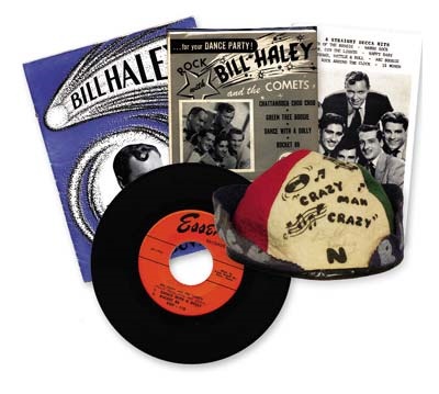 Wow! What a great mix: a felt beanie hat signed by Bill Haley, an Essex Records EP, a promo-tional card signed at American Bandstand, and a 1957 European tour program (some tears and wear).