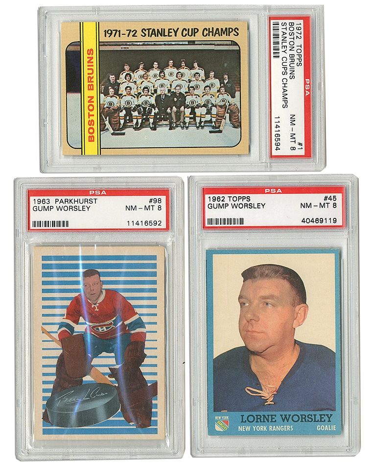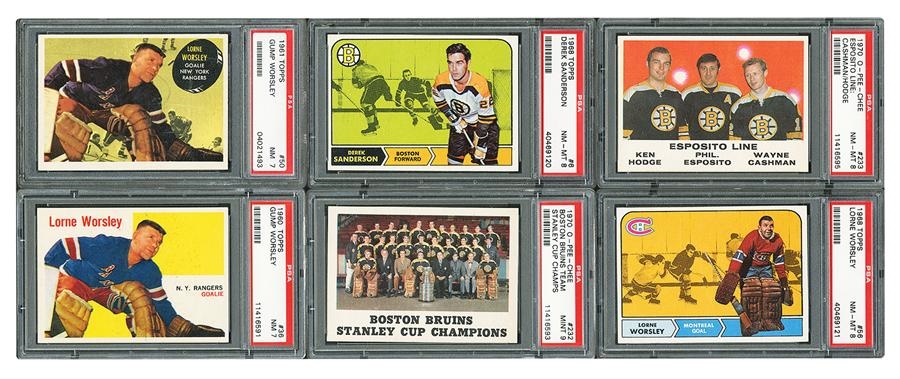 A interesting accumulation highlighted by a Gump Worsley run and Bruins team cards. Hockey cards graded by PSA are as follows. 1960 Topps #36 Worsley PSA 7, 1961 Topps #50 Worsley PSA 7, 1962 Topps #45 Worsley PSA 8, 1963 Parkhurst #98 Worsley PSA 8, 1965 Topps PSA 8's 11 OC, #25, #29, #30, #44 OC, #104 OC, #108. PSA 7#2, #24, #51 PSA 6 #70, #81ST. 1968 Topps, #6 Sanderson, PSA 8, #56 Worsley PSA 8, 1970 OPC #232 Bruins Team PSA 9, #233 Esposito Line PSA 8, 1972 Topps #1 Bruins Team PSA 8, 1973 OPC Rings #2 PSA 7.
