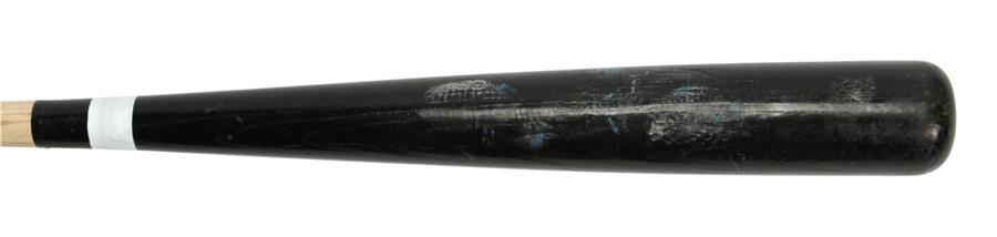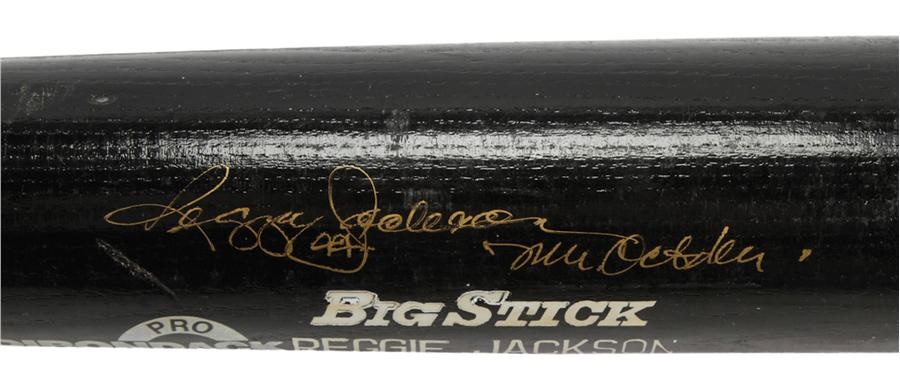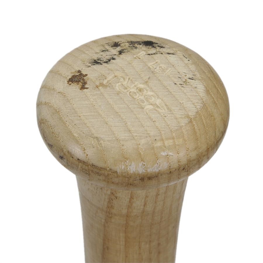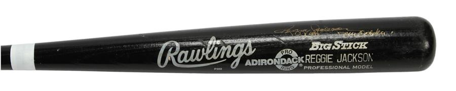 Own this Rawlings 288RJ model game used baseball bat signed in gold on the barrel from Mister October's final season. This 34", 31.5 oz bat exhibits great use. With a cracked handle, ball and seam marks are visible on the barrel are on the bat. There are also some blue marks from American League ball labels.