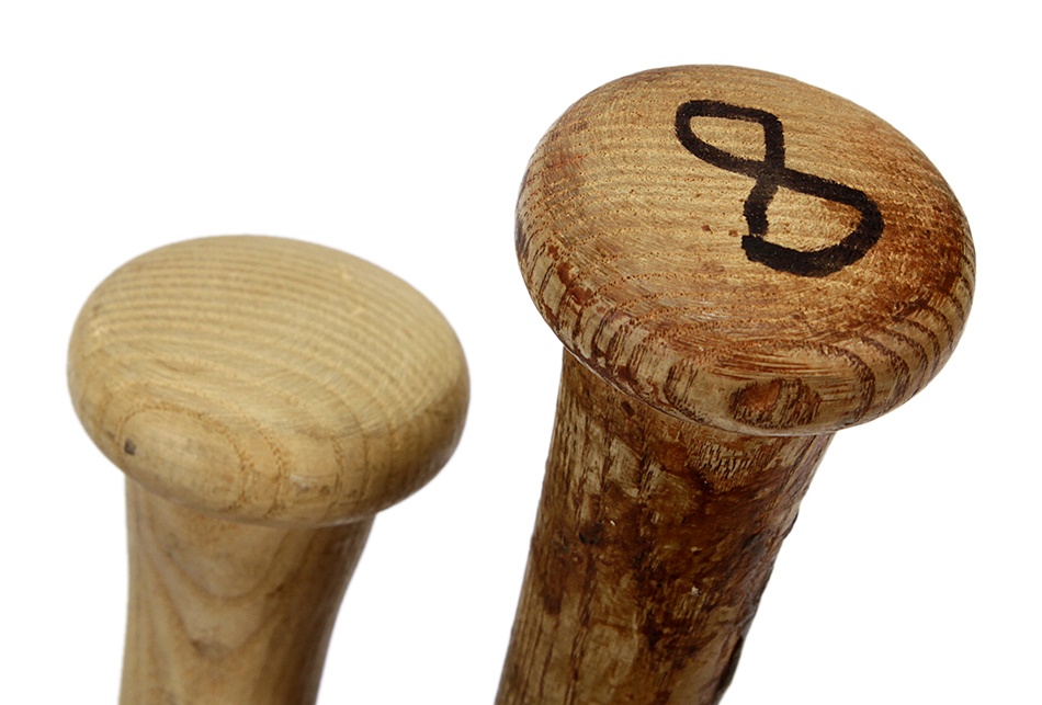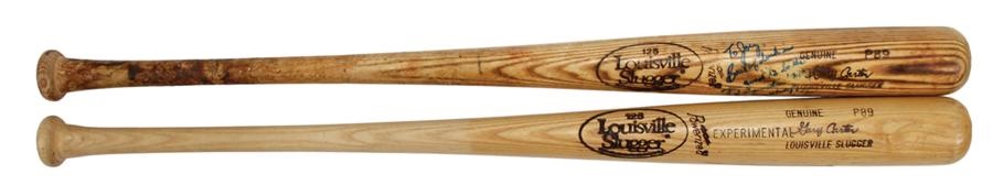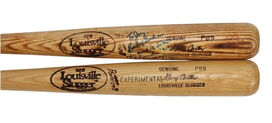 Offered here are two beautiful Gary Carter bats. The first is a game used 34.5", 32.5 oz uncracked Louisville Slugger P89 bat from the 1984-85 period that exhibits great use. It has a lot of pine tar and ball marks on the barrel. Written on the knob is "8" and Carter has signed the barrel with a long inscription in blue Sharpie (grades 6/10). The second is a Gary Carter Louisville Slugger P89 also from the 84-85 period. This uncracked bat is stamped "EXPERIMENTAL" and shows a slight amount of use with a few ball marks on the barrel.