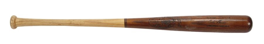 Offered here is a two toned Hillerich & Bradsby K55 model bat used at the start of Andre Dawson's 21-year baseball career. This 35" weighs 33.5 oz and exhibits moderate use on the barrel and has a shaved and cracked handle. Written in marker, "10" appears on the knob above the model number. Signed in gold, the signature grades 7/10.