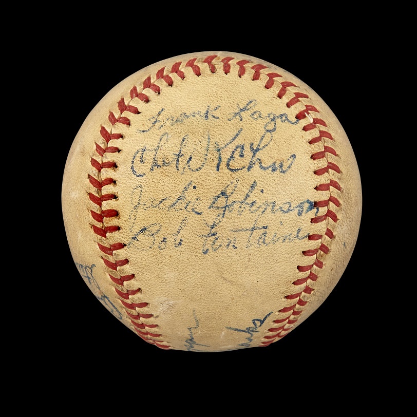 One year before Jackie Robinson famously broke Major League Baseball's color barrier with the Dodgers, the lightning-quick athlete spent a spectacular season with Brooklyn's top farm club in Montreal, where General Manager Branch Rickey had the future Hall of Famer prepare himself for the huge task at hand. Throughout the International League that summer, Robinson endured many hostile crowds, and was even estranged from his manager, the racist Mississippi Clay Hopper, providing Jackie with a taste of what was yet to come This official International League baseball is game-used and features signatures in blue ink that average 6/10. Robinson's signature is clear and located on a side panel. In all, there are eight signatures, including Hopper on the sweet spot, along with Herman Franks. With Robinson batting .349, the Royals won the second of their seven Governor's Cup championships by defeating the Syracuse Chiefs. Interestingly, Jackie was one of THREE black players on that Montreal club, which also featured pitchers John Wright and Roy Partlow.