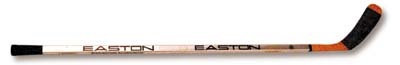 Early 1990's Easton Aluminum 5100 model marked "Gretzky" with an Easton wood blade with black graphics. The wood blade, also stamped "Gretzky", is wrapped in Wayne's distinc-tive style and taped in bulldog. The black foam "Gripper" is there instead of a taped knob and the butt end has been coded by Kings trainer Peter Miller "B75". Better than average use for a Gretzky gamer from this period. A perfect example!