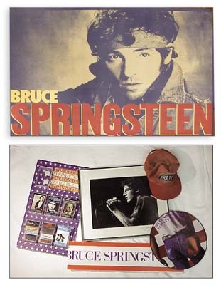 This fabulous single vendor collection includes; Born in USA 46" cardboard sign, BIU 11x19" cardboard cassette sign, 1984 "Bruce" KLOS L.A. promo cap & stickers, great rare mags (Aquarian, Fuse, many pre-1975), "On Tour" card-board posters (2), Tunnel of Love 16x12" diecut cardboard sign, 21 Born in the USA slicks in box, Ronnie Spector "Hollywood" poster & booklet, 1978 gallery photo by famed Montreal photographer framed 16x20" (gorgeous!). Also included are buttons, promo stills, photos, backstage passes, & more. Completing the set is a great poster collection with Promos from Tunnel of Love, ToL Express Tour, ToL "Available Monday" rare private issue, Born In USA June 4th arrival, rare 1980 Asbury Jukes, large concert posters and more. Even the N.J. Assembly Resolution to make Born to Run the State Song is here. A great collection all from one longtime NJ-area collector! Overall EX. (From another vendor).