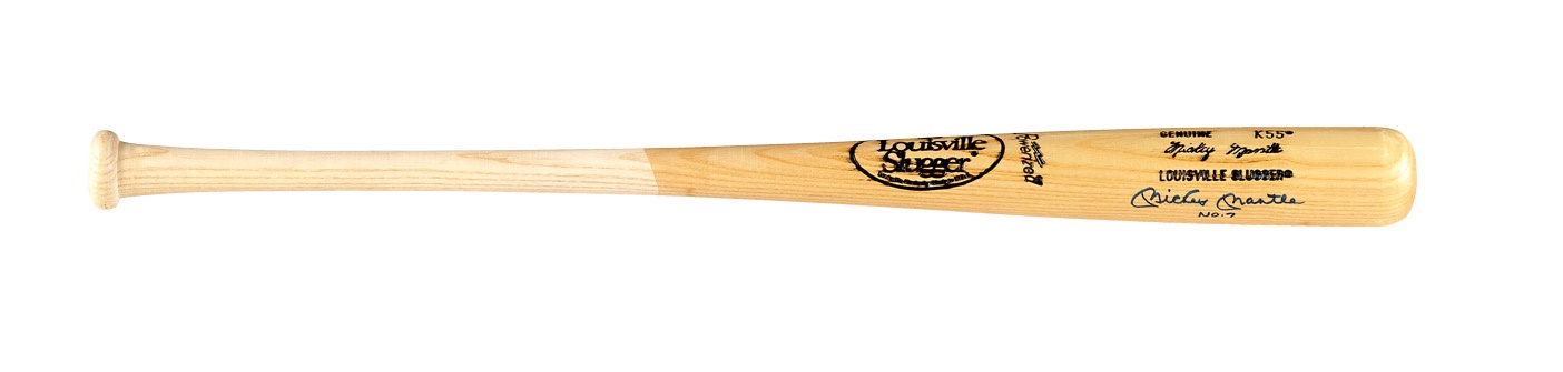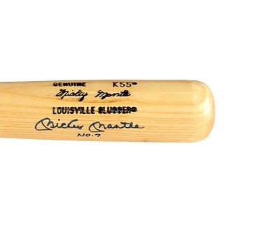 Legendary switch-hitter and American icon Mickey Mantle provided a mint signature on this full-sized, 34-inch Louisville Slugger K55 Mantle store model bat. The blue Sharpie signature with No. 7 inscribed rates a 10 out of 10. The bat is pristine. "The Commerce Comet" was a three-time American League MVP and captured the Triple Crown in 1956. His "mantle" was full of other trophies as well, such as four home run trophies, 20 All-Star awards and seven World Series rings.