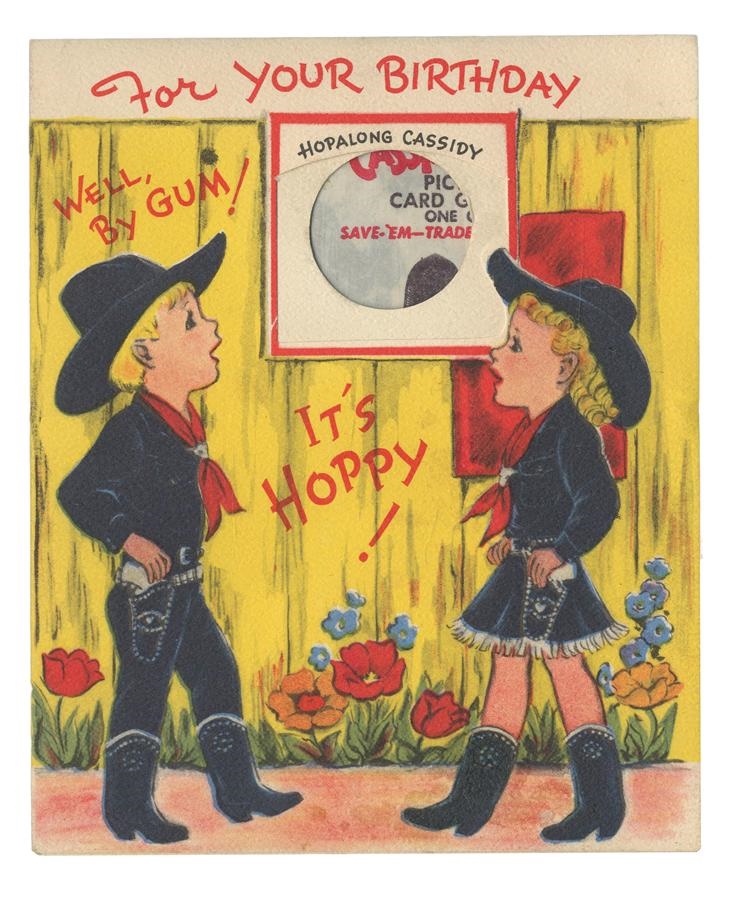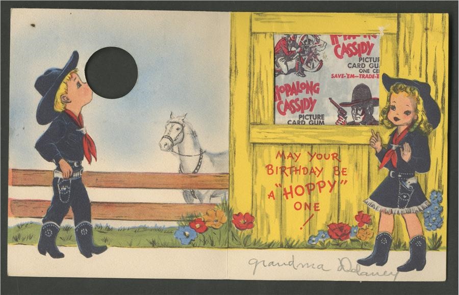 The window on the front reveals an affixed and unopened Hoppy gum card pack. This is the second we have seen. Has some scrapbook residue on verso and name of recipient in pencil inside of the original envelope, otherwise EX condition.