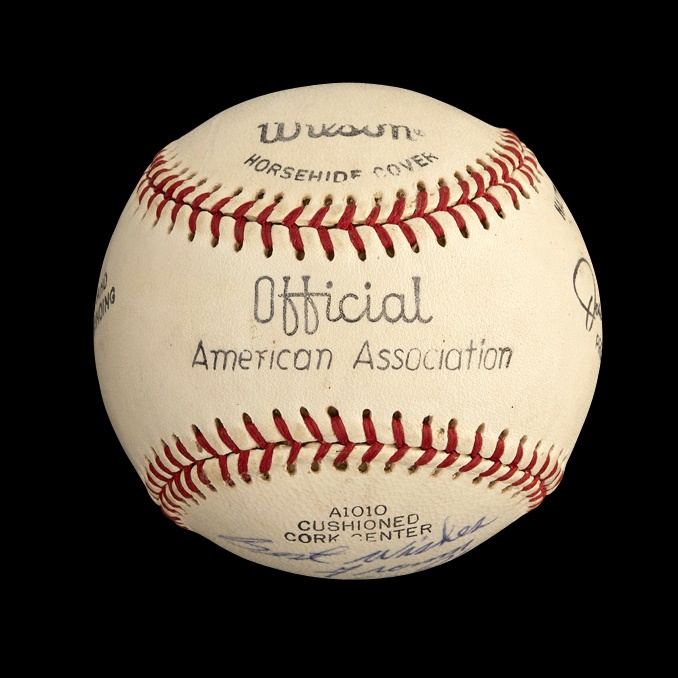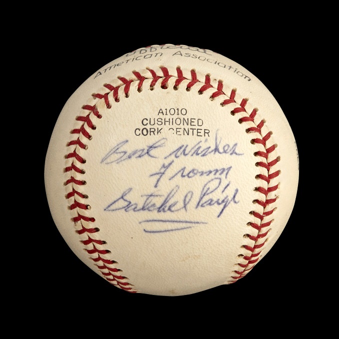 Leroy "Satchel" Paige was the first player ever inducted into the Hall of Fame expressly due to his work in the negro leagues. This official American Association baseball is clean and in EX-MT condition. The signature on a side panel in 8/10 blue ink reads: "BEST WISHES FROM SATCHEL PAIGE." The right-handed pitcher began his professional career in 1926 with the Chattanooga Black Lookouts of the Negro Southern League and, in 1948, became the oldest rookie to play in the major leagues at the age of 42.
