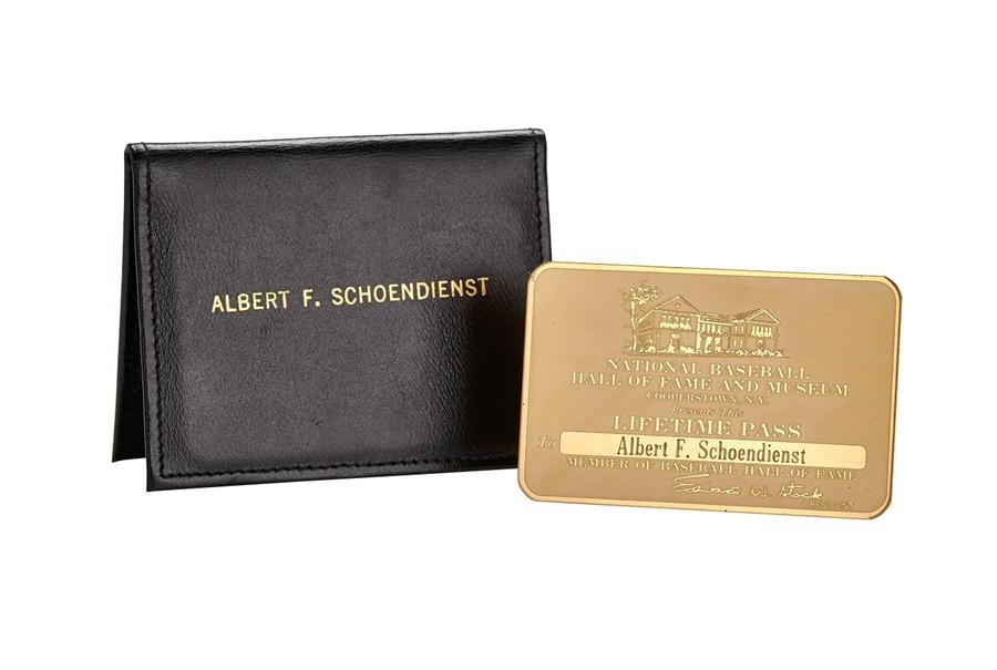 Talk about a "gold membership." This thick pass given to Hall of Famers such as Red Schoendienst can be yours if the price is right. It reads: "NATIONAL BASEBALL HALL OF FAME AND MUSUEM COOPERSTOWN, N.Y. PRESENTS THIS LIFETIME PASS TO ALBERT SCHOENDIENST MEMBER OF BASEBALL HALL OF FAME" and is signed by the president, Edward W. Stock. it comes with custom leather case with Red's name on it in gold and is in NRMT condition with scuff marks on the back.