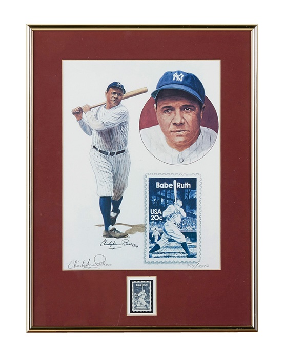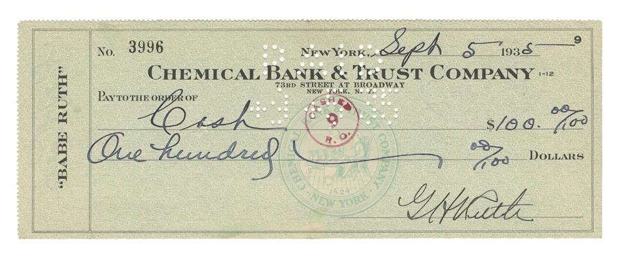 "Check" this out! Straight from the hand of a Hall of Fame legend comes this check from the Chemical Bank and Trust Company that Babe Ruth made out to "Cash" for $100 on September 5, 1935, a few months after his retirement. The signature on the front in black fountain ink rates 9/10 while the one on the back in the same black ink also rates 9/10, There is one fold line in the center of the check. Also included is a framed postage stamp display, yellow Hall of Fame plaque postcard and Perez-Steele postcard. After his brilliant, 15-year run with the Yankees concluded the previous fall, Ruth began the 1935 campaign in the same town where he started his major league career, playing for the Boston Braves. But after seeing his batting average and power output diminish significantly in the first two months of the season, prompting his retirement.