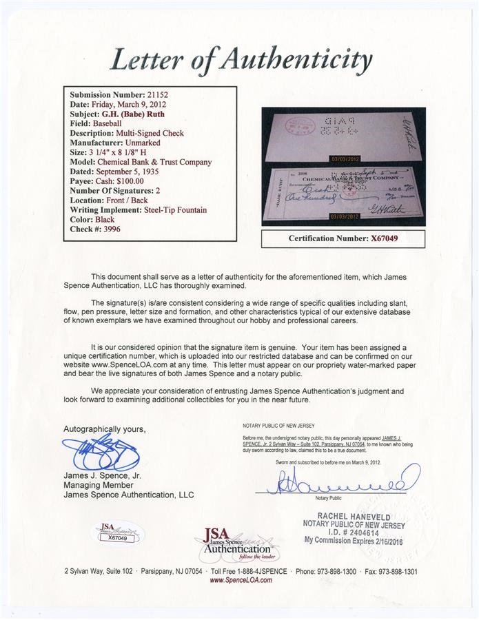 Lot # 269: 1935 Babe Ruth Double-Signed Bank Check