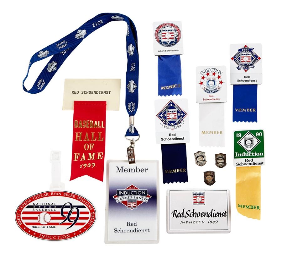 From the personal archives of Hall of Fame second baseman Red Schoendienst come this dozen personal effects such as name tags he wore during his visits to various inductions during the 1980s to present. Three of Red's personally owned sterling silver Hall of Fame logo pins are also in the mix, as well as a 1999 Induction golf bag tag. Some of these items are quite rare since only honored members receive them. All are in EX-MT condition or better. Schoendienst continues to serve as a special coach for the St. Louis Cardinals, the organization through which he came up in 1945.