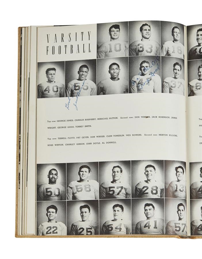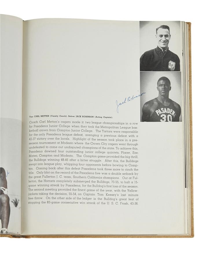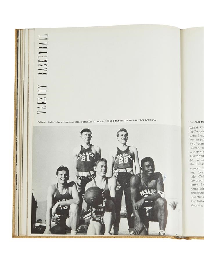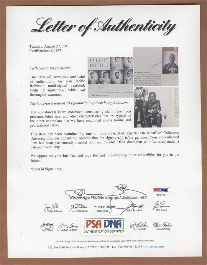 One of the greatest athletes of his or any day, Jackie Robinson was a four-sport star while attending Pasadena Junior College in California, excelling in baseball, football, basketball and track. From that 1938-39 academic year comes this yearbook that features some of the earliest signatures from the Hall of Fame legend, including: "BEST WISHES JACKIE ROBINSON" on his football photo, "JACK ROBINSON" on his basketball Photo and "JACK" next to another basketball shot. Signatures average 8 or better in strength, and the book is signed by others. It remains in EX=MT condition and comes with a PSA/DNA. The subject of last spring's hit movie "42," Jackie went on to star at UCLA and in the negro leagues before breaking baseball's color barrier in 1947 with Branch Rickey's Brooklyn Dodgers. Though he only played 10 major league seasons, Jackie Robinson batted .311 and left an indelible mark as a civil rights icon.
