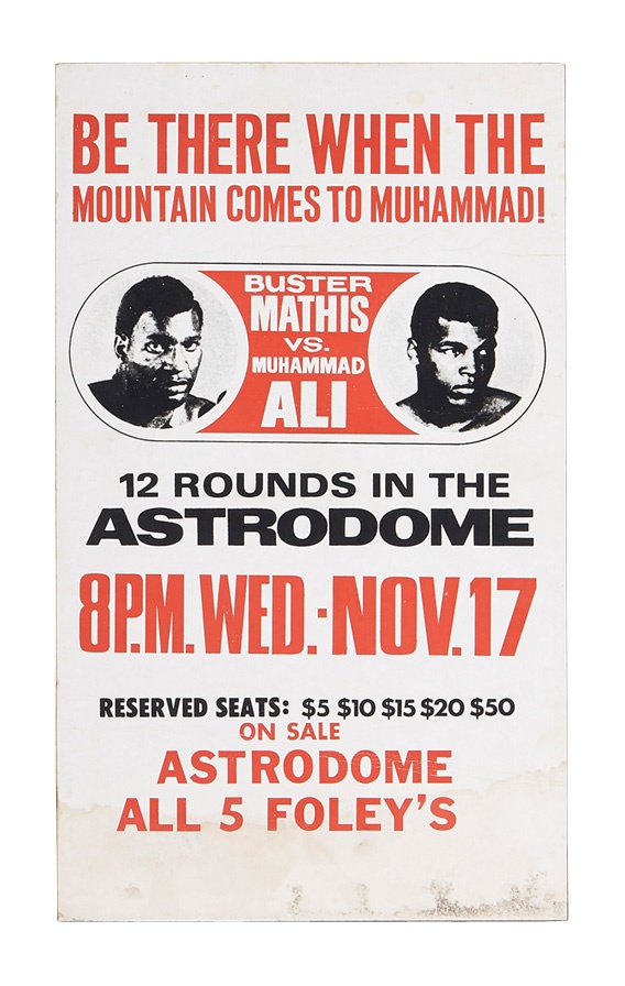 Former world heavyweight champion Muhammad Ali fought Buster Mathis on November 17, 1971 at the Astrodome in Houston. Ali won by unanimous decision after 12 rounds to successfully defend his NABF Heavyweight Title. Presented here is an exceptionally rare, original on-site cardboard poster which has been mounted on heavy board. There is some wrinkling, plus staining and mildew present on the bottom border. The images and print remain bold on the 14" x 24" poster... one of the very few examples we have seen.