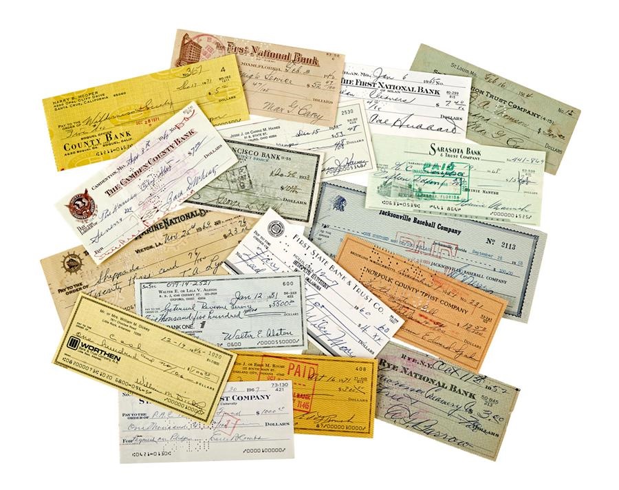 Take these to the bank! A diverse collection with over 50 bank checks signed by baseball greats, the majority of whom are Hall of Famers and most of them deceased. The checks are canceled and mostly in EX or better condition. Wilcey Moore of the legendary 1927 Yankees is the best of the non-HOFers. Other notables include: Alston, Barrow, Carey, Combs, Dickey, Haines, Hooper, Kelly, Lyons, Manush, Hubbard (torn corner), Roush, Spahn, Terry and Wheat, among many others. There are only a few duplicates, and most come with corresponding yellow Hall of Fame postcards and/or Perez-Steele postcards.